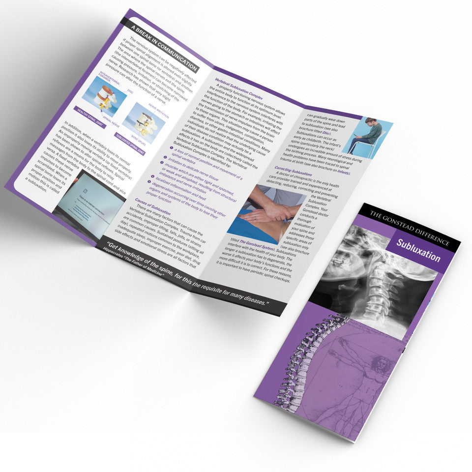 This scientifically based brochure details how vertebral subluxations occur, how they affect the body, and how Gonstead chiropractic addresses subluxations. Sold in packs of 50.