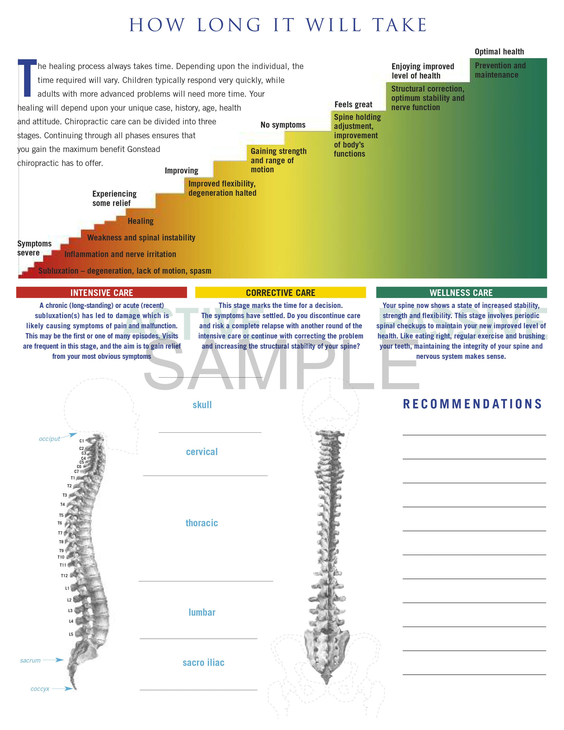 This “How Long Will It Take?” chart helps patients understand that true healing is a process—not a quick fix. Designed for chiropractic offices, this visual guide clearly explains the stages of chiropractic care and what patients can expect as their spine and nervous system heal over time.