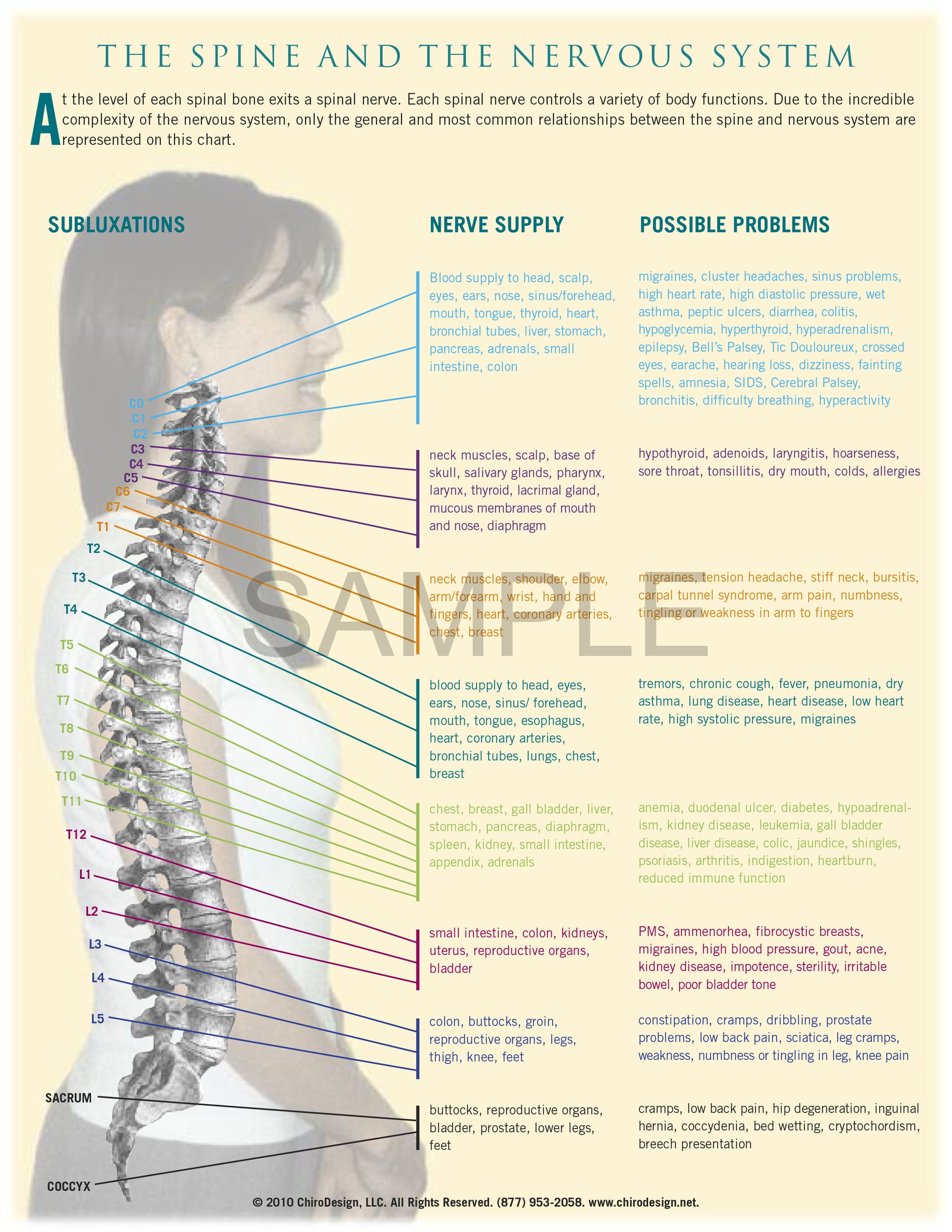 Help patients understand how their spine connects to their overall health with this clear, easy-to-read Spine & Nervous System Chart. This educational chart illustrates the relationship between each spinal level and the areas of the body it influences, making complex neurological concepts simple and approachable.